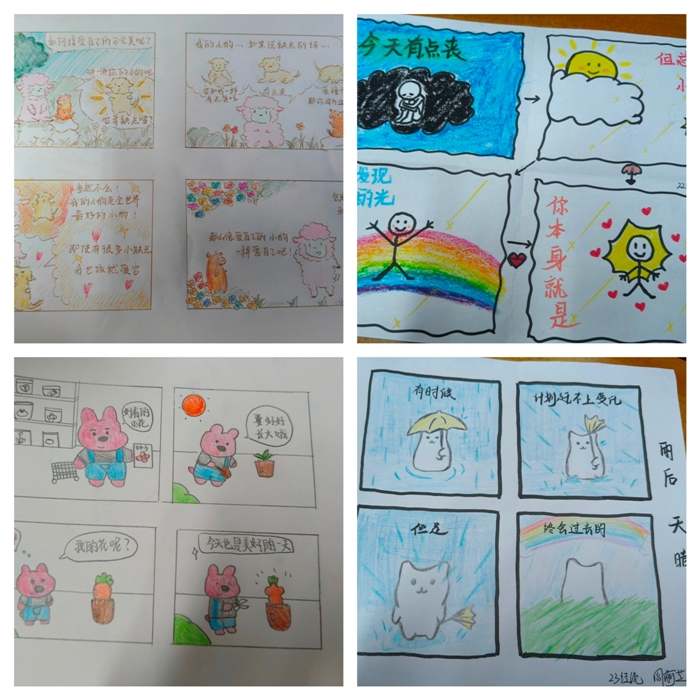 在众多优秀作品中,创作者们以细腻笔触和鲜活角色,将情绪的起伏与心理的成长娓娓道来。例如,有小羊通过关爱小狗学会“接纳自身不完美”;有萌猫在雨后天晴中传递“困境终会过去”的信念;还有小兔从种花意外到收获惊喜,诠释“换个角度遇见美好”的思维;更有简笔小人从情绪低落到发现自我光芒,书写“自我接纳即阳光”的主题。每一幅作品都是一次与情绪的真诚对话,既体现出对情绪的敏锐觉察,也传递出温暖而坚定的心理能量。