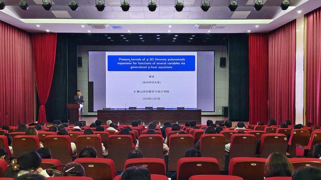 曹健教授首先介绍了杭州师范大学数学学院研究生招生情况,并鼓励热爱数学、立志科研的同学报考杭州师范大学。然后作了题为“Poisson kernels of q-3D Hermite polynomials expansion for functions of several variables via generalized q-heat equations”的报告。该报告讲述了q-热方程与q-正交多项式的深刻联系,以及如何一步步对已有的数学问题进行多角度思考,提出问题并解决问题。