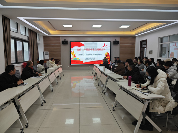 为深入学习贯彻党的二十届四中全会精神,12月24日下午,数学与统计学院在横江校区图书馆附楼301报告厅举办党的二十届四中全会精神宣讲会。马克思主义学院陈玲老师应邀主讲,会议由学院党总支书记刘双四主持,学院全体教职工参加学习。