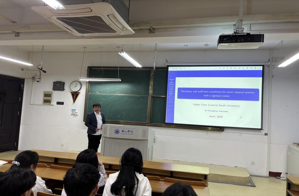 2026年4月20日晚,中南大学陈和柏教授应邀来到黄山学院数学与统计学院,在横江校区1403教室,为数学与统计学院师生带来题为“Necessary and Sufficient Conditions for Some Classical Systems with a (Global) Center”(一些经典系统存在全局中心的充要条件)的高水平学术报告。本次报告由数学与统计学院院长胡建伟主持,学院相关专业教师、学生到场聆听学习。